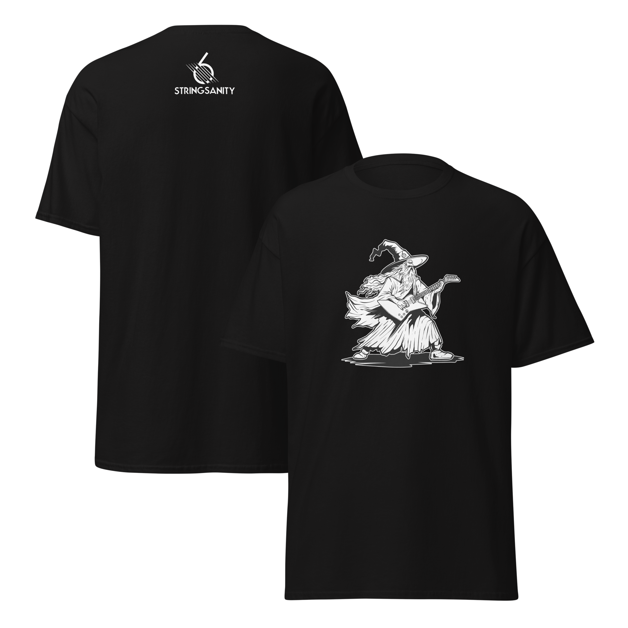 The guitar wizard casts the spell of eternal six string fascination. The 100% cotton unisex classic tee sits nicely, maintains sharp lines around the edges, and goes perfectly with layered streetwear outfits. The front has the wizard casting his guitar spell and the back has the 6StringSanity logo.